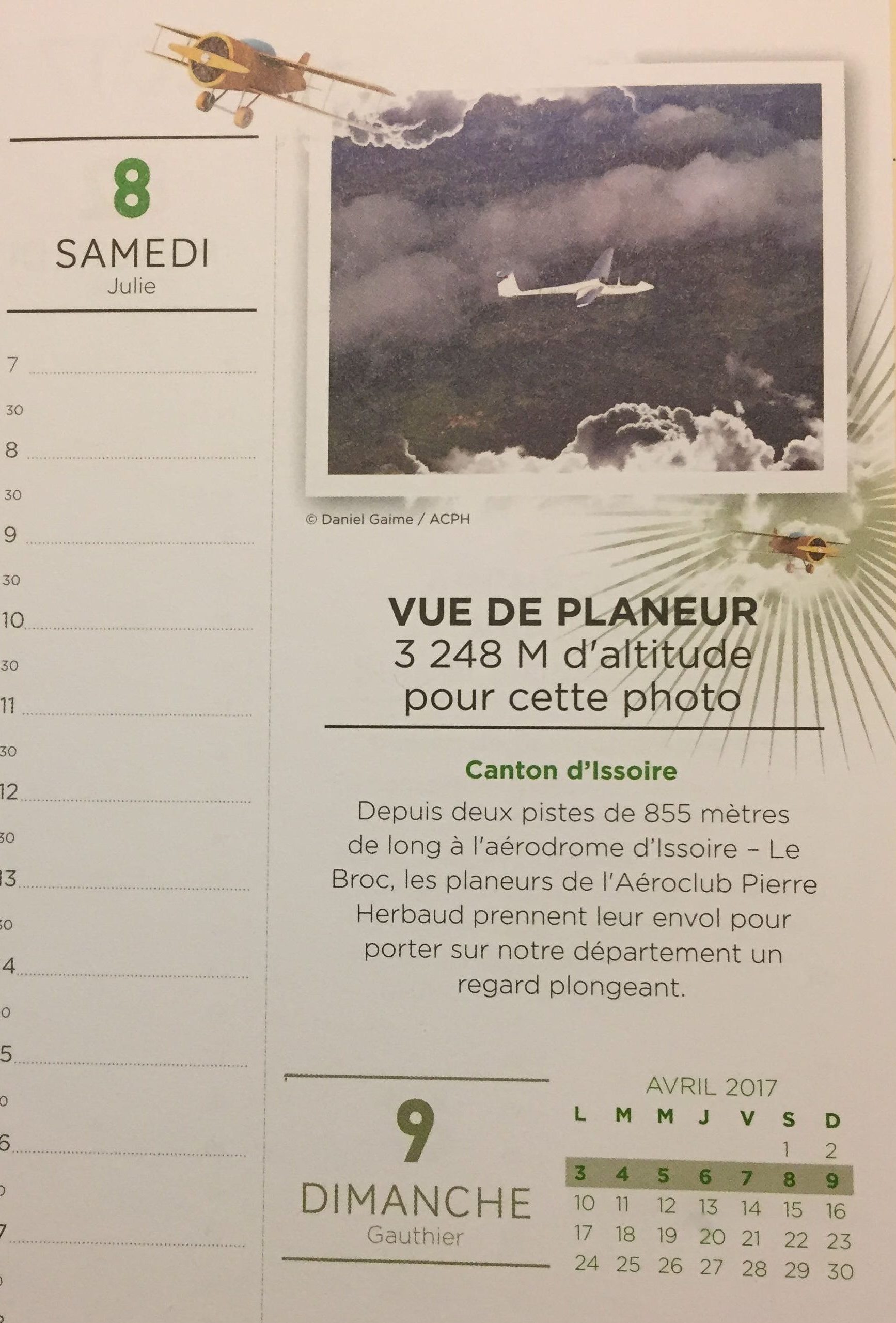 L’ACPH est présent dans l’agenda 2017 du conseil départemental. Cet agenda est consacré à tous ce qui volent dans le Puy de Dôme.