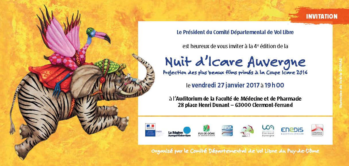 Invitation du Comité Départemental de Vol Libre du Puy-de-Dôme Invitation Nuit Icare Auvergne 27 Janvier 2017 à la présentation des nuits d’Icare Auvergne 2017.